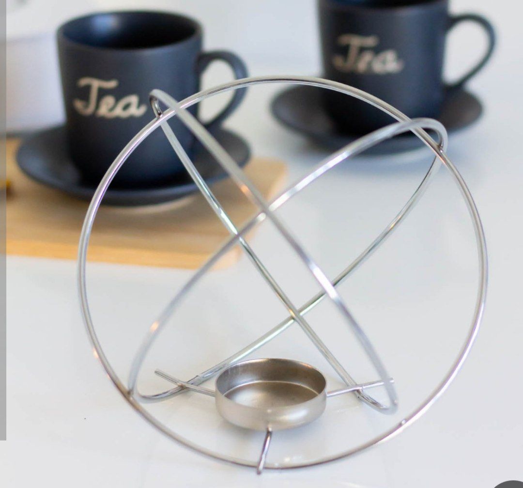 این تصویر یک جا شمعی دکوری فلزی با طراحی هندسی/کرهای است که برای قرار دادن یک شمع کوچک یا شمع معطر در وسط آن طراحی شده است. متن به زبان فارسی توضیح میدهد که این محصول در رنگ نقرهای موجود است.