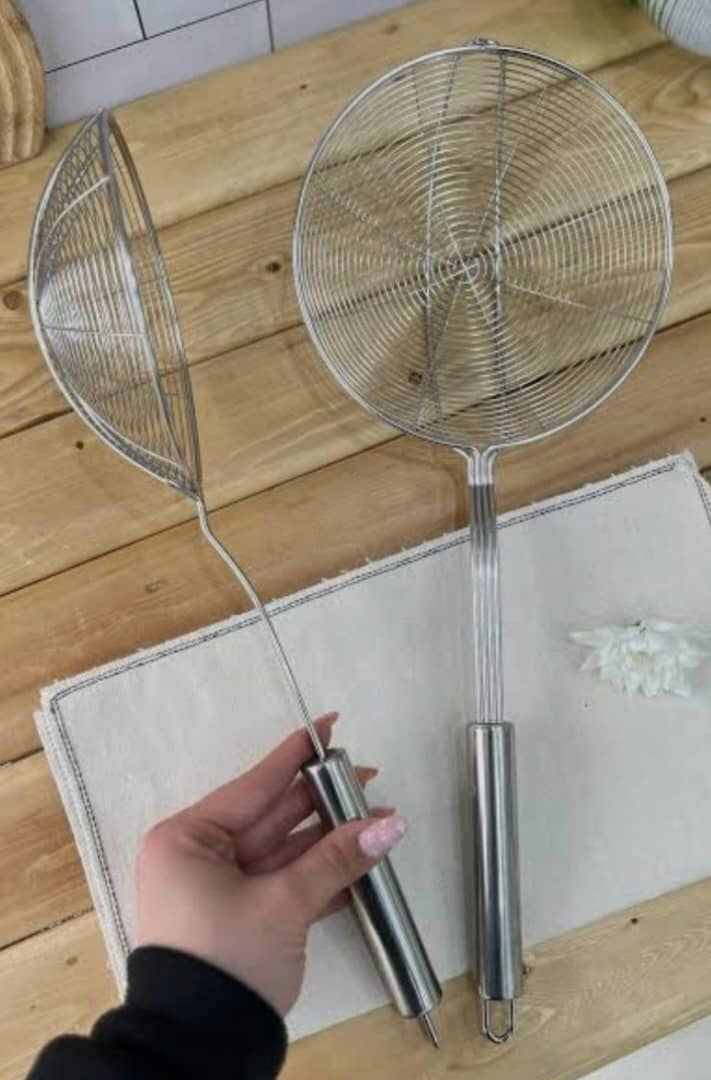 از جنس استیل نقرهای دایرهای شکل مدل تخت دارای تک دسته استیل مناسب برای گرفتن روغن اضافه غذاهای سرخ شده قابل استفاده در منزل، کافیشاپ