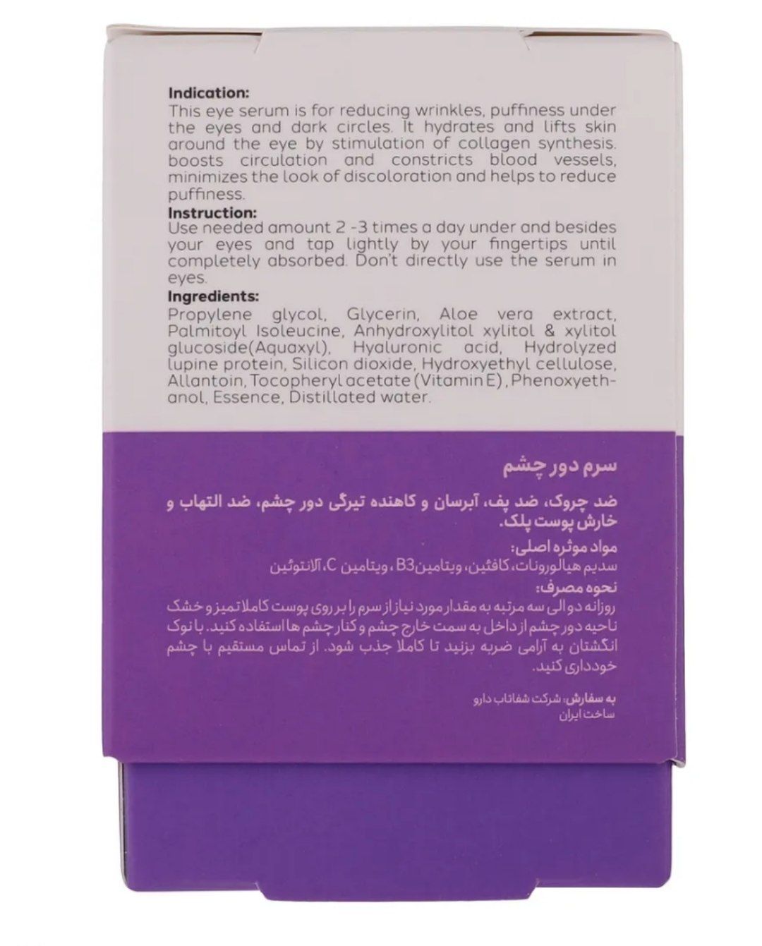 روزانه دو الی سه مرتبه به مقدار مورد نیاز از سرم را بر روی پوست کاملا تمیز و خشک ناحیه دور چشم از داخل به سمت خارج چشم و کنار چشم ها استفاده کنید. با نوک انگشتان به آرامی ضربه بزنید تا کاملا جذب شود.از تماس مستقیم با چشم خودداری کنید.