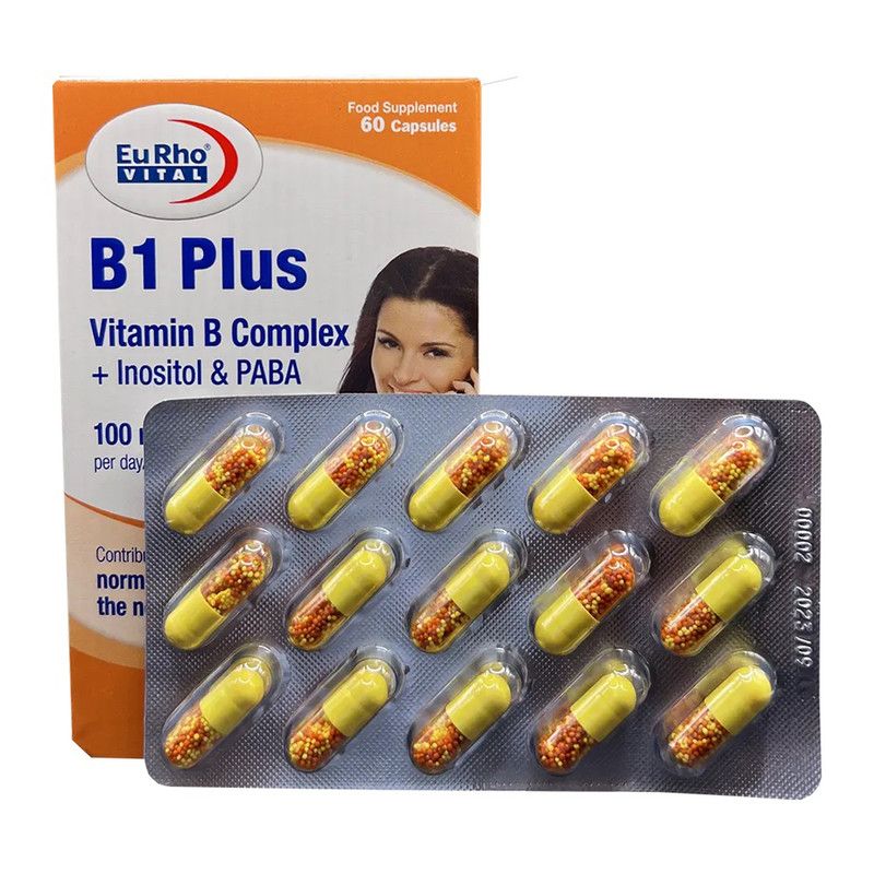 کپسول B1 پلاس یوروویتال حاوی 100 میلیگرم ویتامین B1 بههمراه دیگر ویتامینهای B از جمله اینوزیتول (B8) و پابا (B10) است که باعث حفظ سلامت سیستم عصبی مرکزی و محیطی میشود.