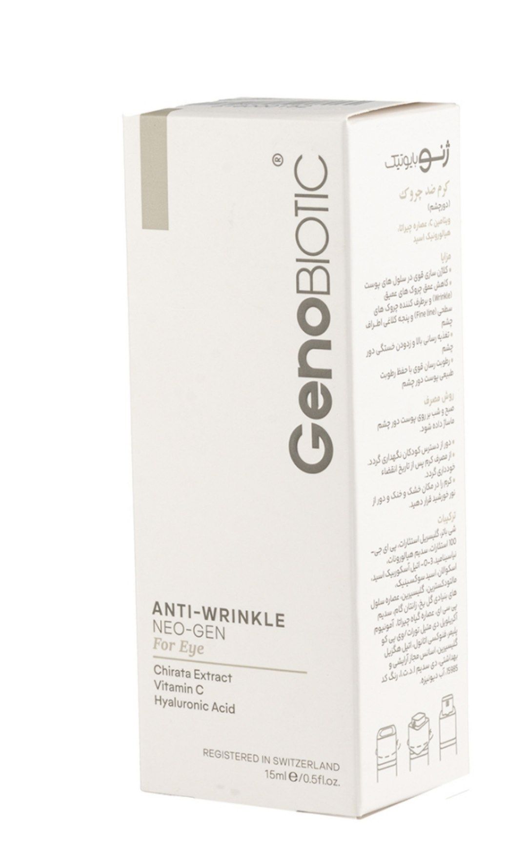 چین و چروکهای اطراف چشم دلایل مختلفی از جمله افزایش سن و سال، پلک زدن، عادات غلط مالیدن چشم با قدرت و یا استفاده از محصولات مراقبتی بیکیفیت باشد. با مرور زمان چین و چروک افزایش یافته و پوست حساس اطراف چشم دچار پیری و یا سیاهی میگردد. یکی از راههای پیشگیری از ایجاد چین و چروک استفاده از کرمهای مراقبتی دور چشم است. کرم ضد چروک دور چشم ژنوبایوتیک با بهره گیری از خواص گیاه چیترا به رفع خطوط پنجه کلاغی اطراف چشم کمک میکند. این کرم سبب تولید و نوسازی سلولهای پوستی جدید میشود و به جوانسازی پوست اطراف چشم کمک میکند. هیالورونیک اسید موجود در این کرم پوست را به خوبی آبرسانی کرده و مانع از خروج رطوبت از پوست میگردد. ویتامین سی موجود در این محوصل آنتی اکسیدان قوی بوده که سبب کلاژن سازی و رفع پف و سیاهی اطراف چشم شده و خاصیت ارتجاعی پوست را بهبود میبخشد. استحکام بافت پوست میتواند پوستی شاداب و عاری از چین و چروک برای شما به ارمغان آورد
