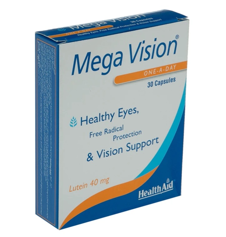 قرص مگا ویژن تقویت چشم (Health Aid Mega Vision) مکمل تخصصی چشم و بینایی محصولی از شرکت Health Aid است که حاوی 40 گرم لوتئین در هر کپسول می باشد که با داشتن خاصیت آنتی اکسیدانی از چشم در برابر آسیب های نوری و آب مروارید و سایر بیماری های چشمی محافظت می کند.مصرف بهترین قرص تقویت چشم و بینایی یکی از بهترین روش های پیشگیری از آسیب های چشم و تاری دید می باشد که توسط اغلب پزشکان توصیه می گردد.